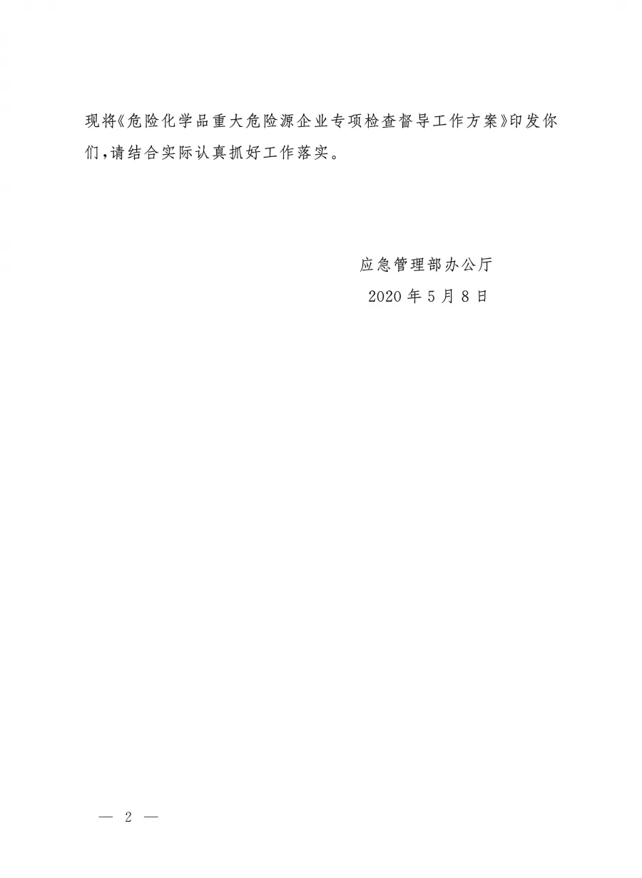 | 應(yīng)急廳〔2020〕23號(hào) 危險(xiǎn)化學(xué)品重大危險(xiǎn)源企業(yè)專項(xiàng)檢查督導(dǎo)工作方案 |
